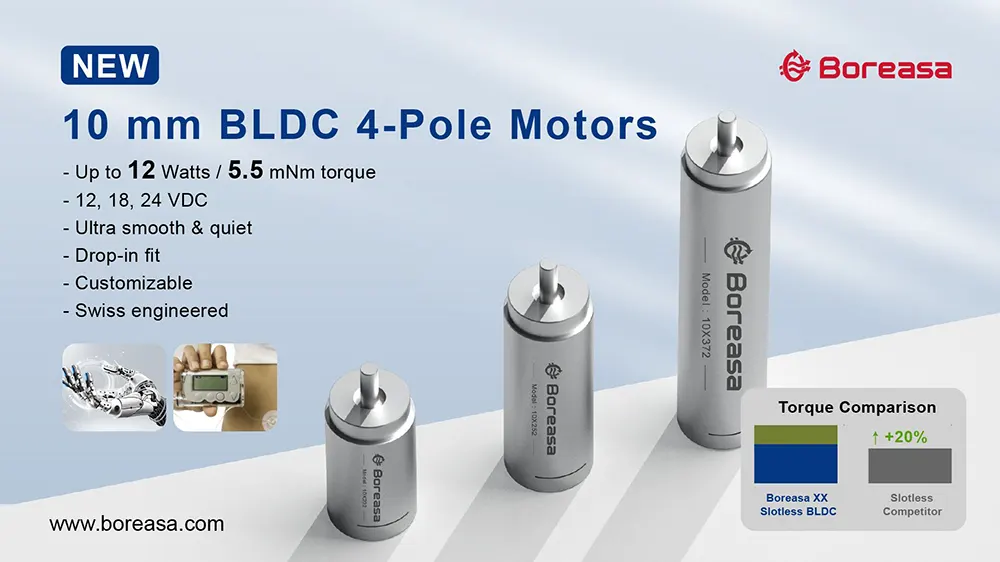 A novidade da linha Boreasa de Motores é o BLDC 4-Pole de 10 mm, que foi projetado para movimento ultrasuave, ruído mínimo e alto torque em um espaço compacto – atributos indispensáveis para aplicações de precisão em setores como dispositivos médicos, robótica e automação.