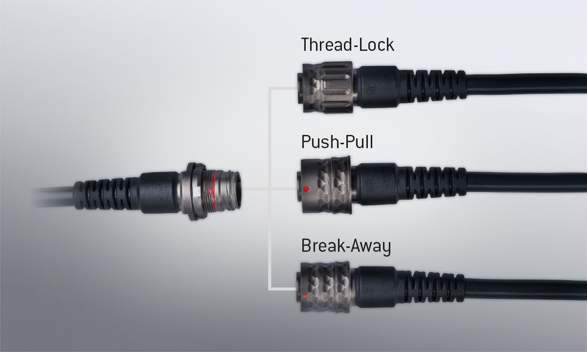 O conector da linha AMC T possui 3 opções de travas que podem ser acopladas em um mesmo conector, sendo essas opções rosqueada (“Thread-Lock”), “Push-Pull” e “Break-Away”.